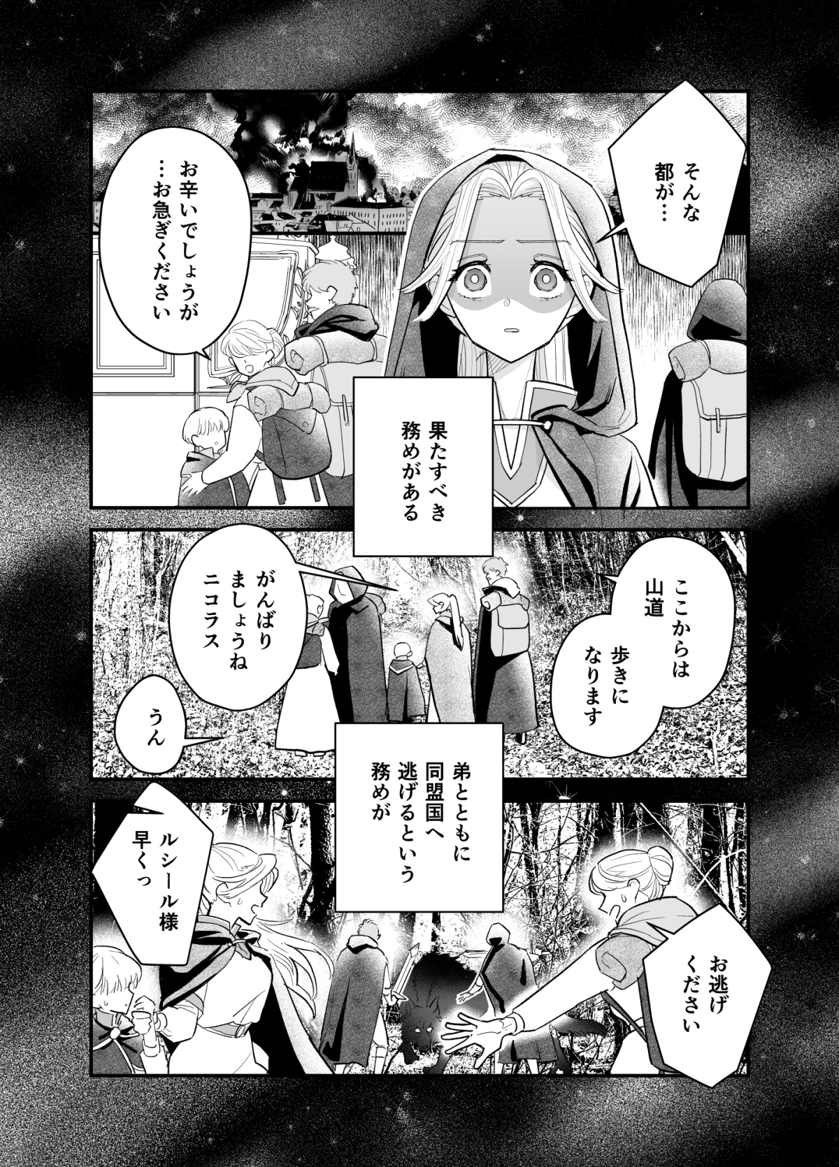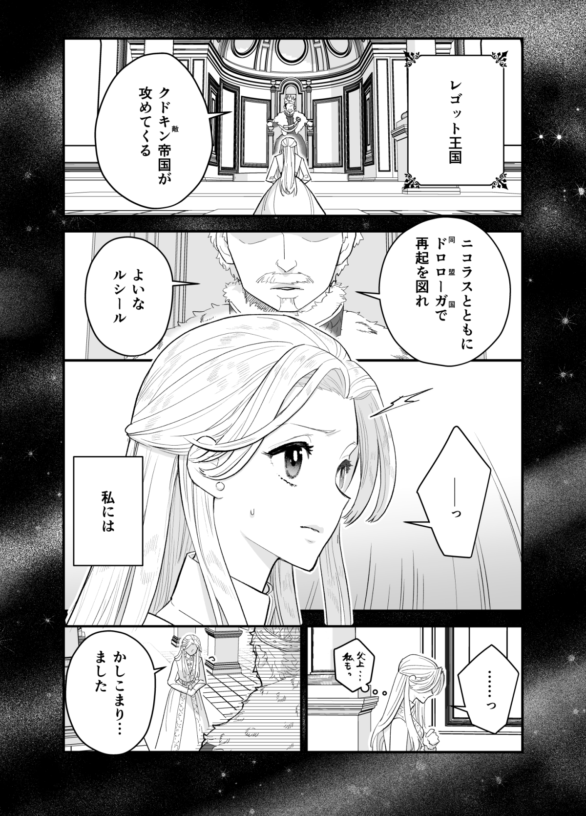 同盟国へ逃れる途中、危ないところを敵クドキン帝国の零細傭兵団長アルベリックに助けられたレゴット国王女ルシールと幼い弟王子ニコラス。身分を隠したまま傭兵団で保護されたルシールとニコラスは生まれて初めて責任と束縛から解き放たれのどかな暮らしを味わっていた。