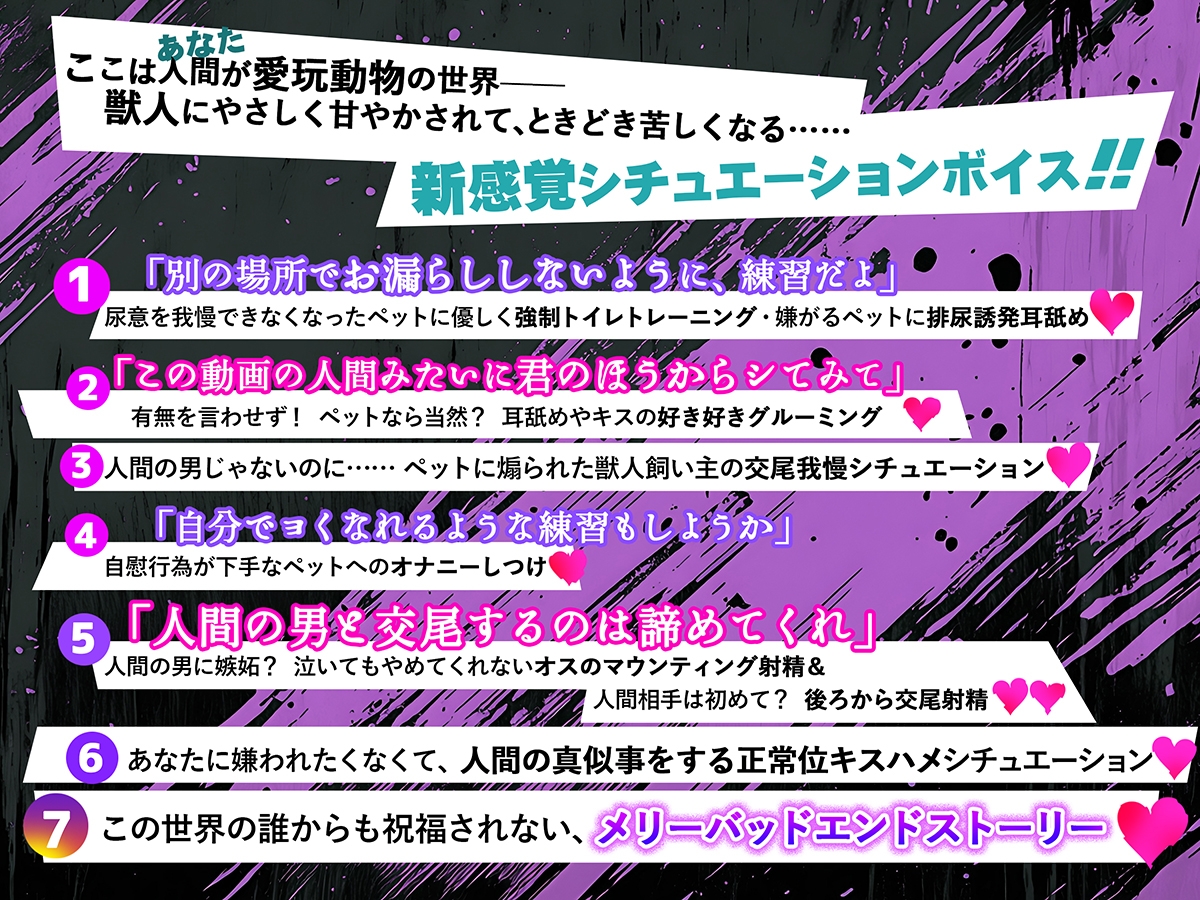 ◇イザク ドーベルマンの獣人・雄の成犬 184cm/75kg CV:八神仙 ◇あなた 獣人が人口の7割を占める、地球とよく似た惑星のお話。 ◆トラック1 「ヒューマンペットショップより」(14:47) 「は……頭がおかしくなりそうだ」泣き出すペットをあやすような優しいキス/「あの抑制剤は君に合ってないみたいだな」お風呂の途中で発情期の症状が出るペットにぬるぬる乳首責め 【ご注意】登場人物