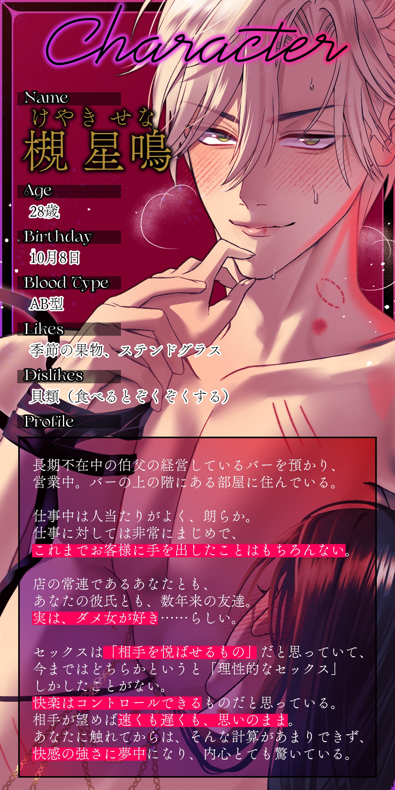 君はいつもの席に座って、カウンターの中の俺に、無邪気に目くばせ。 「ん。キスおいしい」 ◆人物紹介◆ ◆トラック構成◆「俺、ダメ女が好きなんだよ。 ……って、君にちゃんと、言ったよね?」