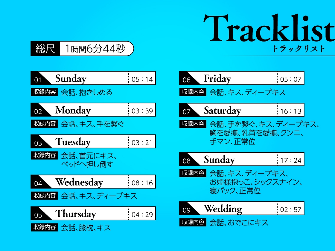 全編ダミーヘッドマイクを使用し、スタジオで収録 「先に言っておくけど……俺、君を泣かせると思うよ。いろんな意味で」 ▼Track01 Sunday(05:14) ▼共通同梱特典 Cast◆・◆Introduction◆・◆