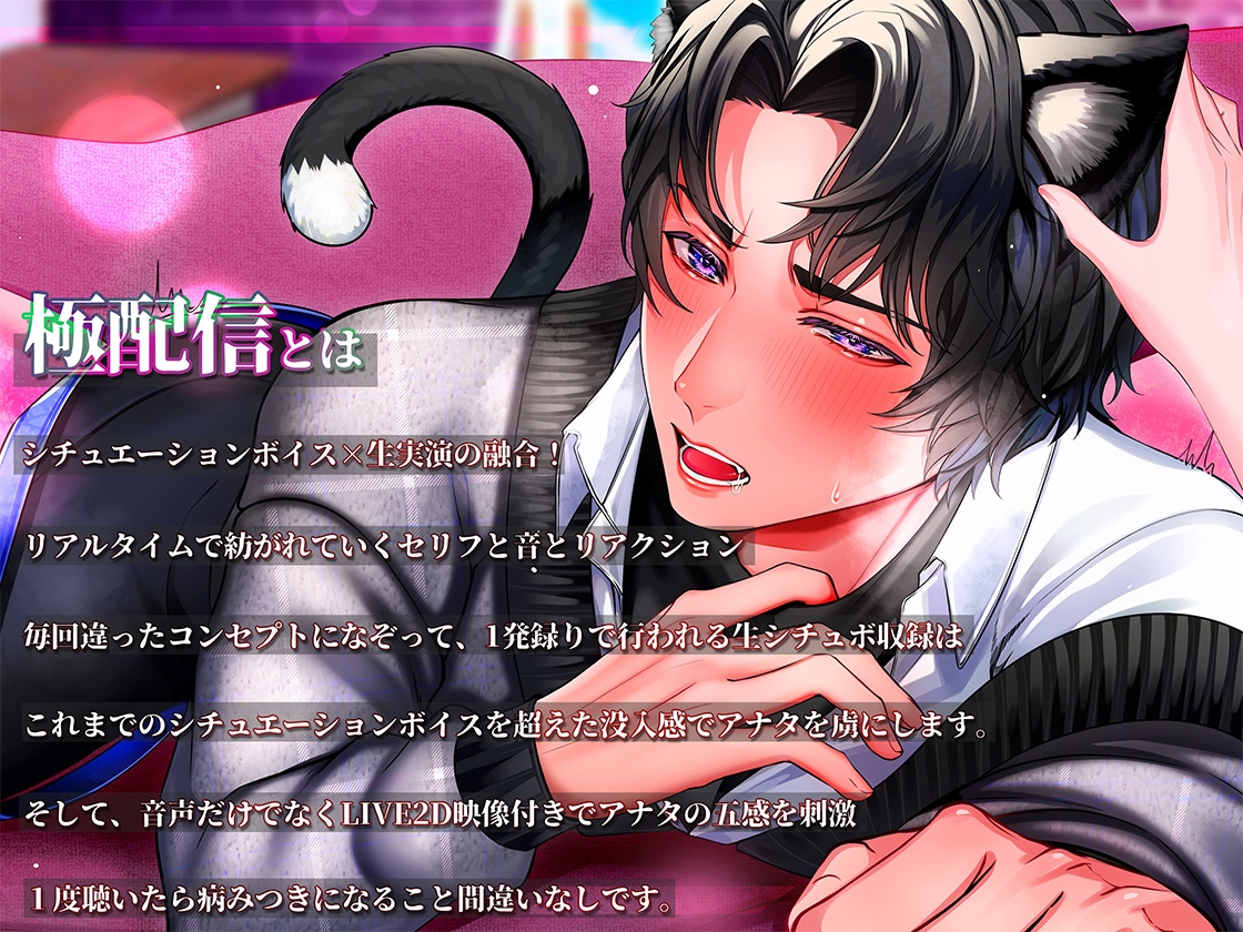 「おかえりにゃん」と恥ずかしそうにお出迎え。 いつものシチュエーションボイスに、”リアルな実演”を掛け合わせた新感覚エンターテイメント、それが「極配信(きわみはいしん)」です。あなたが家に帰ると、大好きな彼がニャンコになっていた!?
