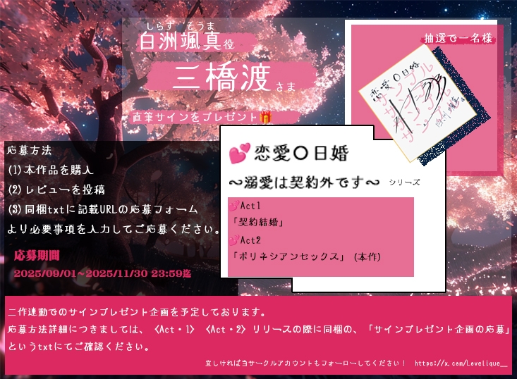 実際のように長々と時間をかけた音声にはなっておりません。ポリネシアンセックス(風)と思っていただければ良いかもしれません。リリース後の予定➊ 2作品連動キャンペーン★白洲颯真役 三橋渡様の直筆サインをプレゼント!!