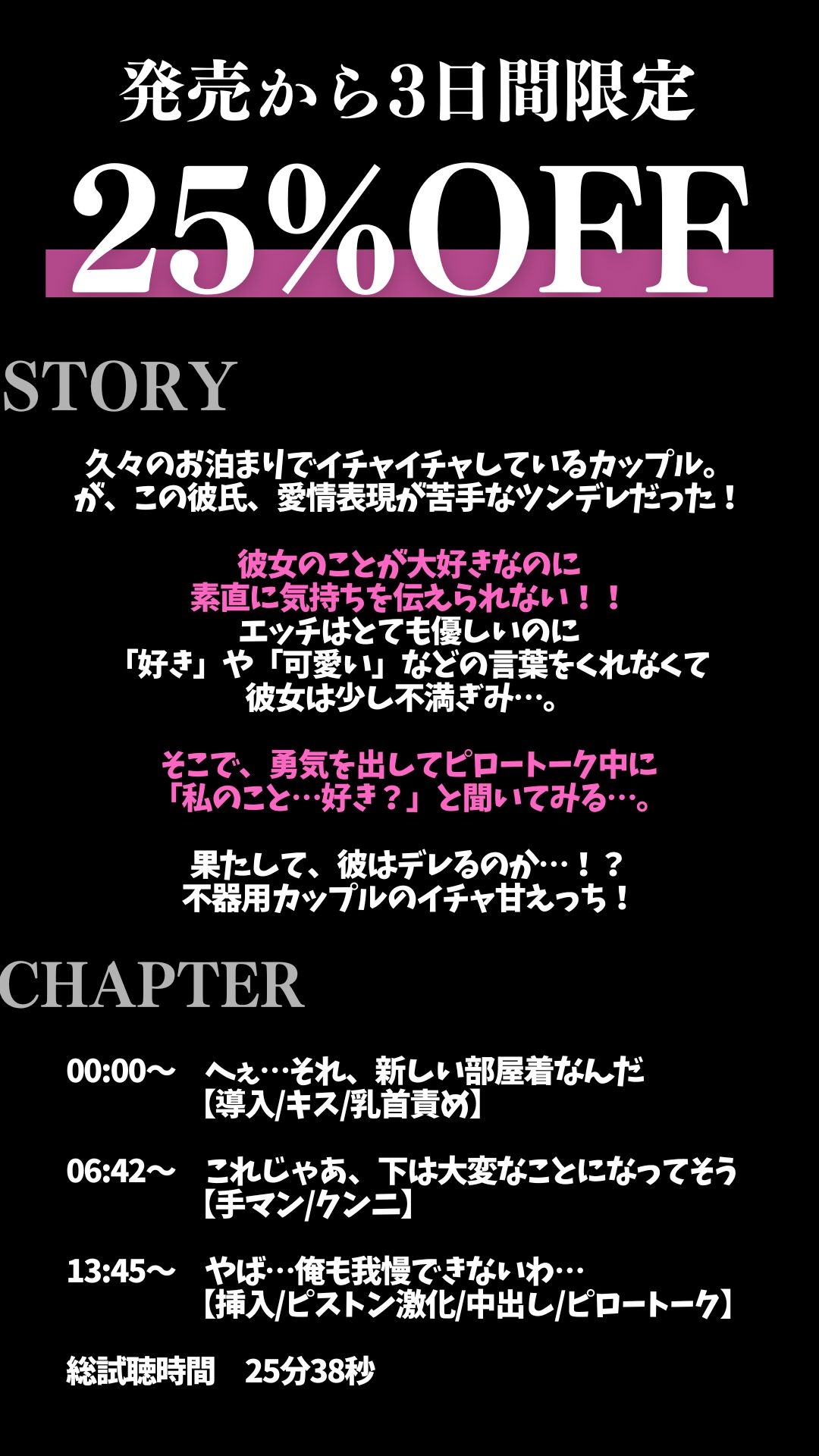 サークル名 dots 販売日 2025年09月16日 0時 ジャンル ラブラブ/あまあま ほのぼの 恋人同士 ツンデレ 中出し ノーマルプレイ クンニ 乳首責め 声優 ながしま シナリオ 悠希 年齢指定 18禁 作品カテゴリ 乙女向け 作品形式 ボイス・ASMR ファイル容量 790.77MB 品番 RJ01468178 価格 495円~