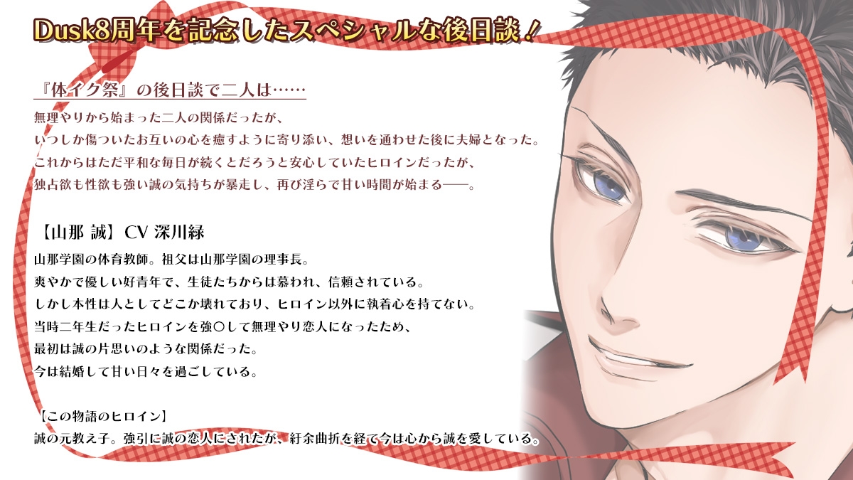 『体イク祭』後、二人は―― 暴力的な事件から始まった三人での関係だったが、 種族の違いや障害を乗り越えて結ばれたヒロインとラグエル。 ■タイトル / 『Dusk8 周年記念作品 体イク教師~Sweet Days~』Dusk8周年を記念した甘々な後日談!