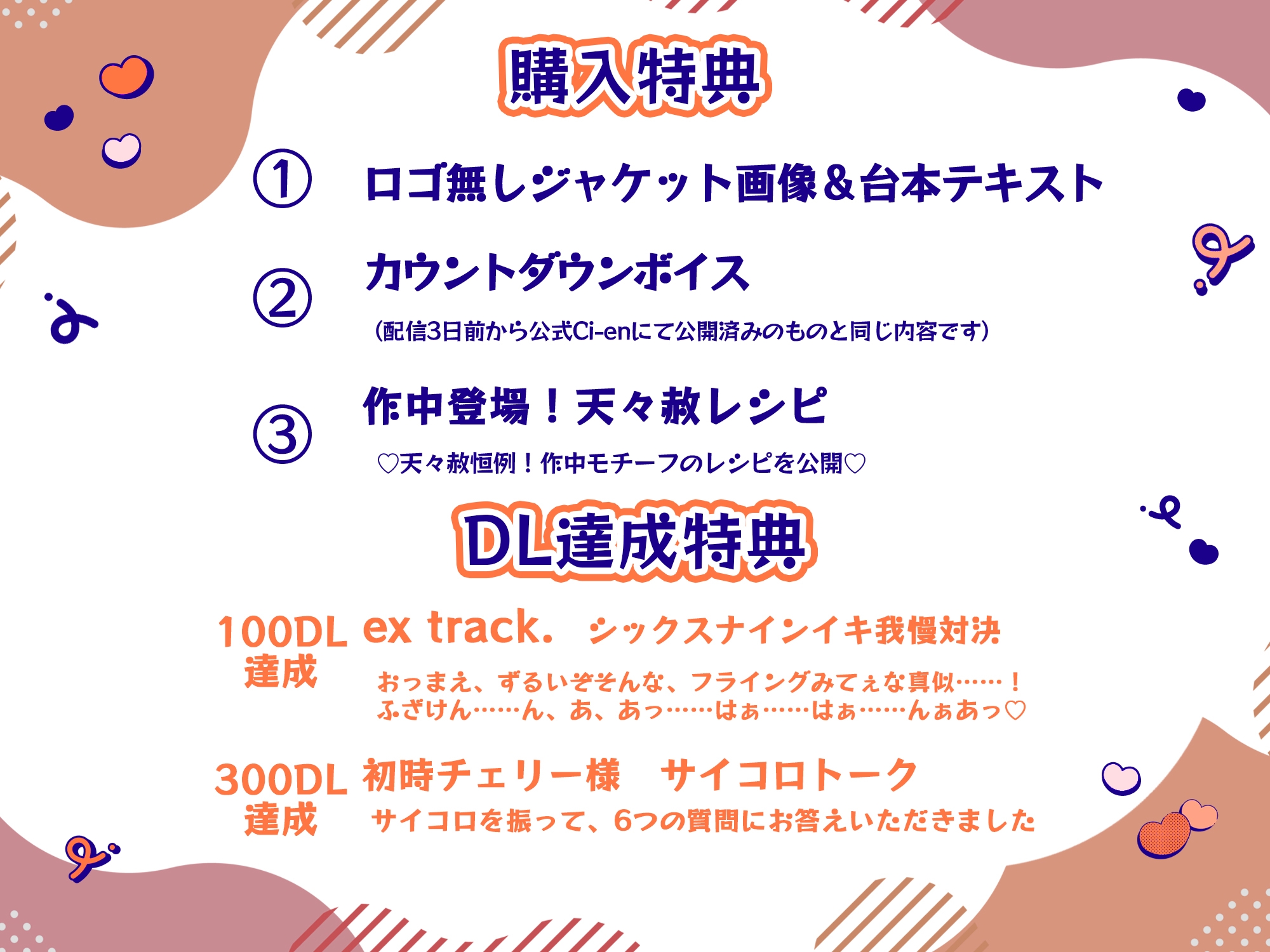 サークル名 天々赦 販売日 2025年11月14日 0時 ジャンル 連続絶頂 女性優位 クンニ 下克上 男性受け 手コキ 中出し 巨根 声優 初時チェリー イラスト てば シナリオ 秋月ひらぎ 年齢指定 18禁 作品カテゴリ 乙女向け 作品形式 ボイス・ASMR イベント がるまにオンリー ファイル容量 3.68GB 体験版 体験版ダウンロード 専売表記 DLsite専売 品番 RJ01506041 価格 1,485円~