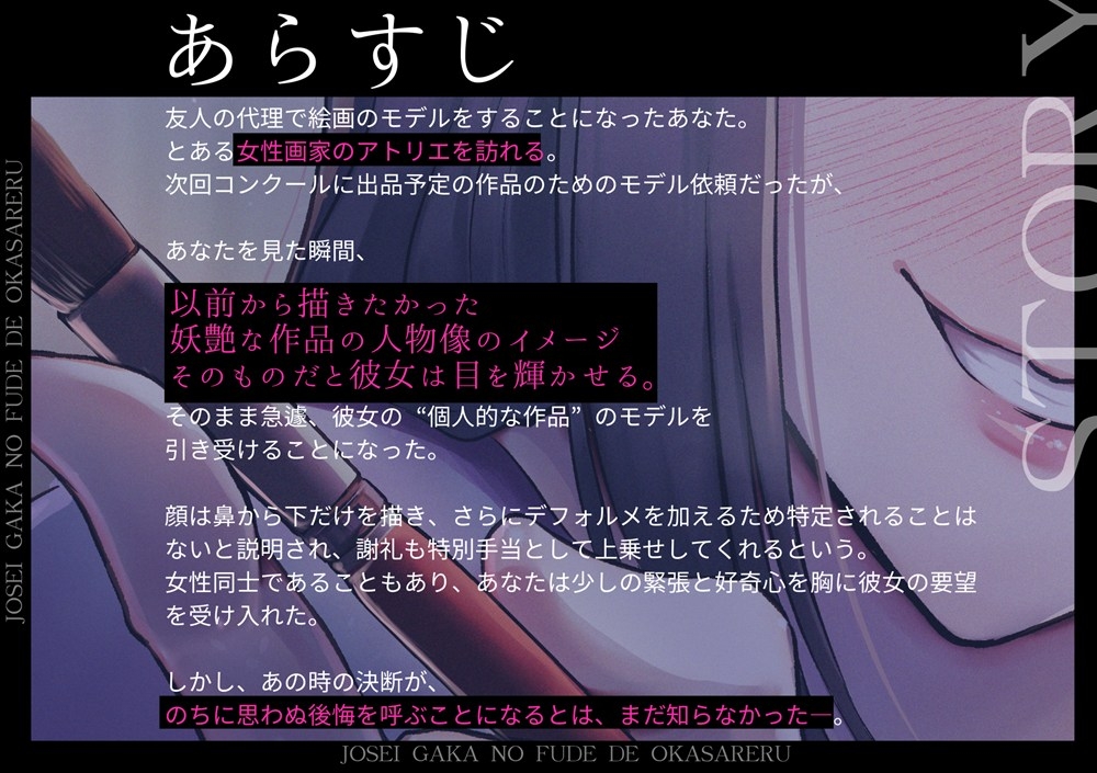 友人の代理で絵画のモデルをすることになったあなた。とある女性画家のアトリエを訪れる。 CV:柊あみか ( https://twitter.com/hiragiamika )あらすじ